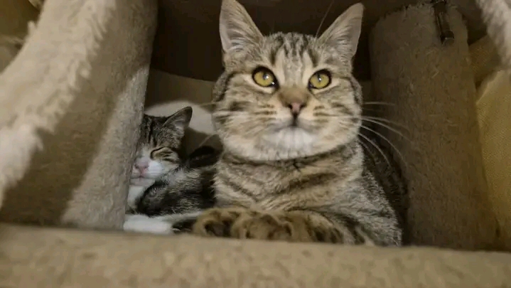 Waarschijnlijk broer en zus (al zou je dat gezien hun formaat niet zeggen -- Rafiki past bijna 2x in zijn zus Kyara) en allebei afkomstig uit een grote groep zwerfkatten: onze dappere Rafiki en lieve Kyara. 🐾