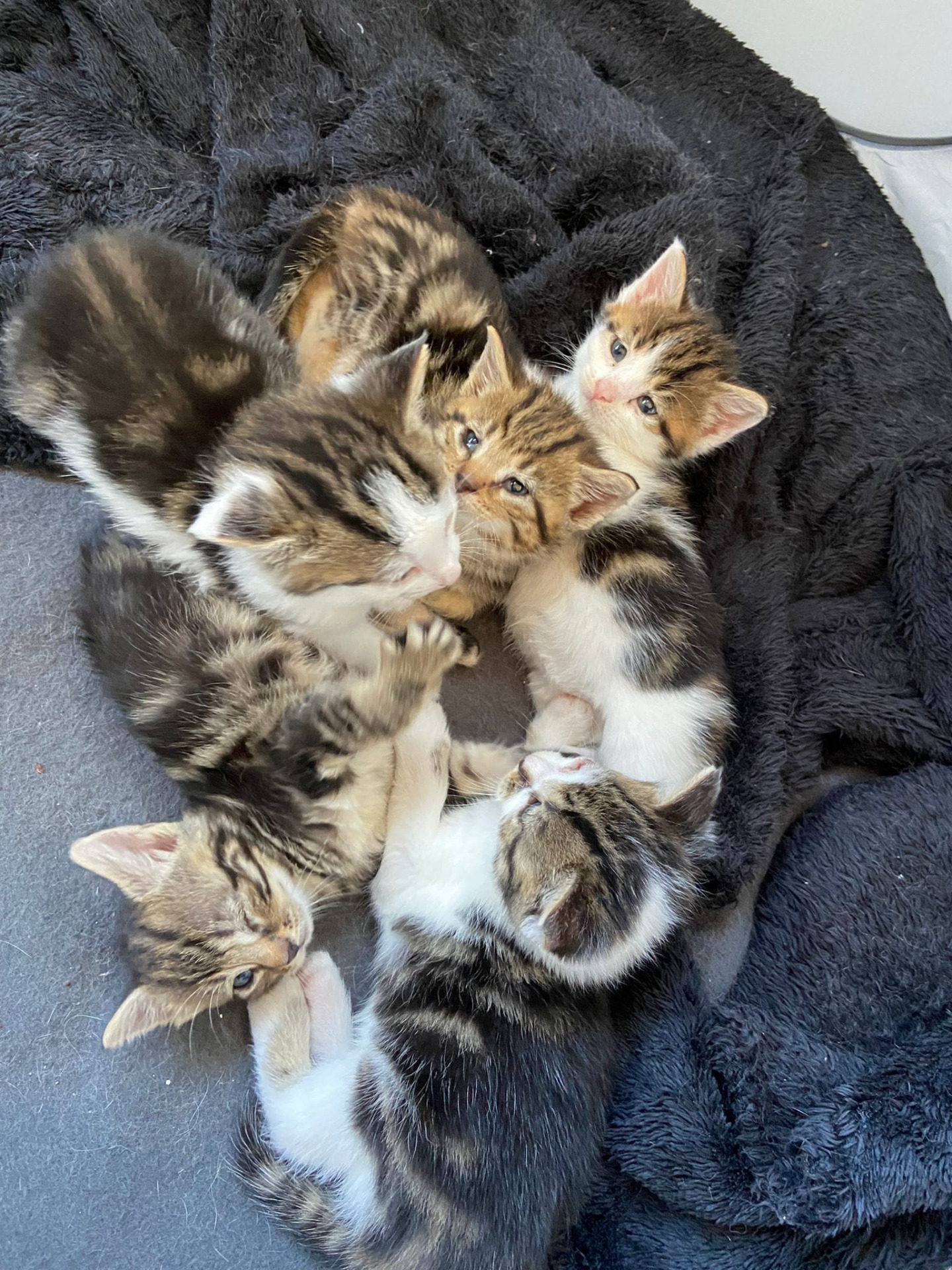 De kittens worden weer goed verzorgd door hun eigen mama. Mama is nog wat bang en wilt niet op de foto, maar kijk eens wat een prachtige kindjes ze heeft!
