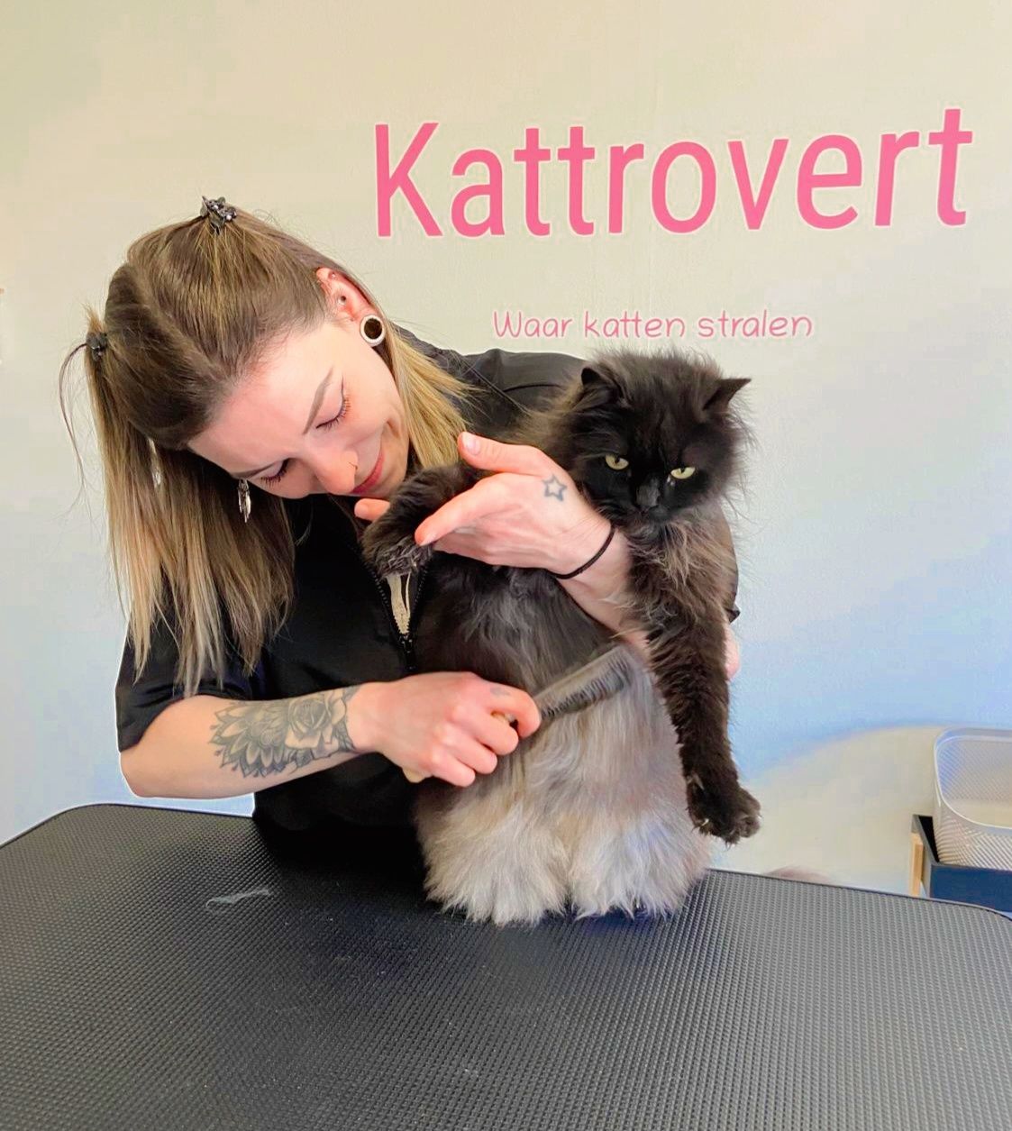 Wij kregen een telefoontje van deze lieve kattentrimster. Of ze ons misschien kon helpen met katjes die vachtverzorging nodig hebben. Komt dat even goed uit. James is nog niet zo lang binnen. In zijn prachtige lange vacht zaten enkele klitten. Dat kan pijnlijk zijn voor een kat, daar moest zeker wat aan gedaan worden!