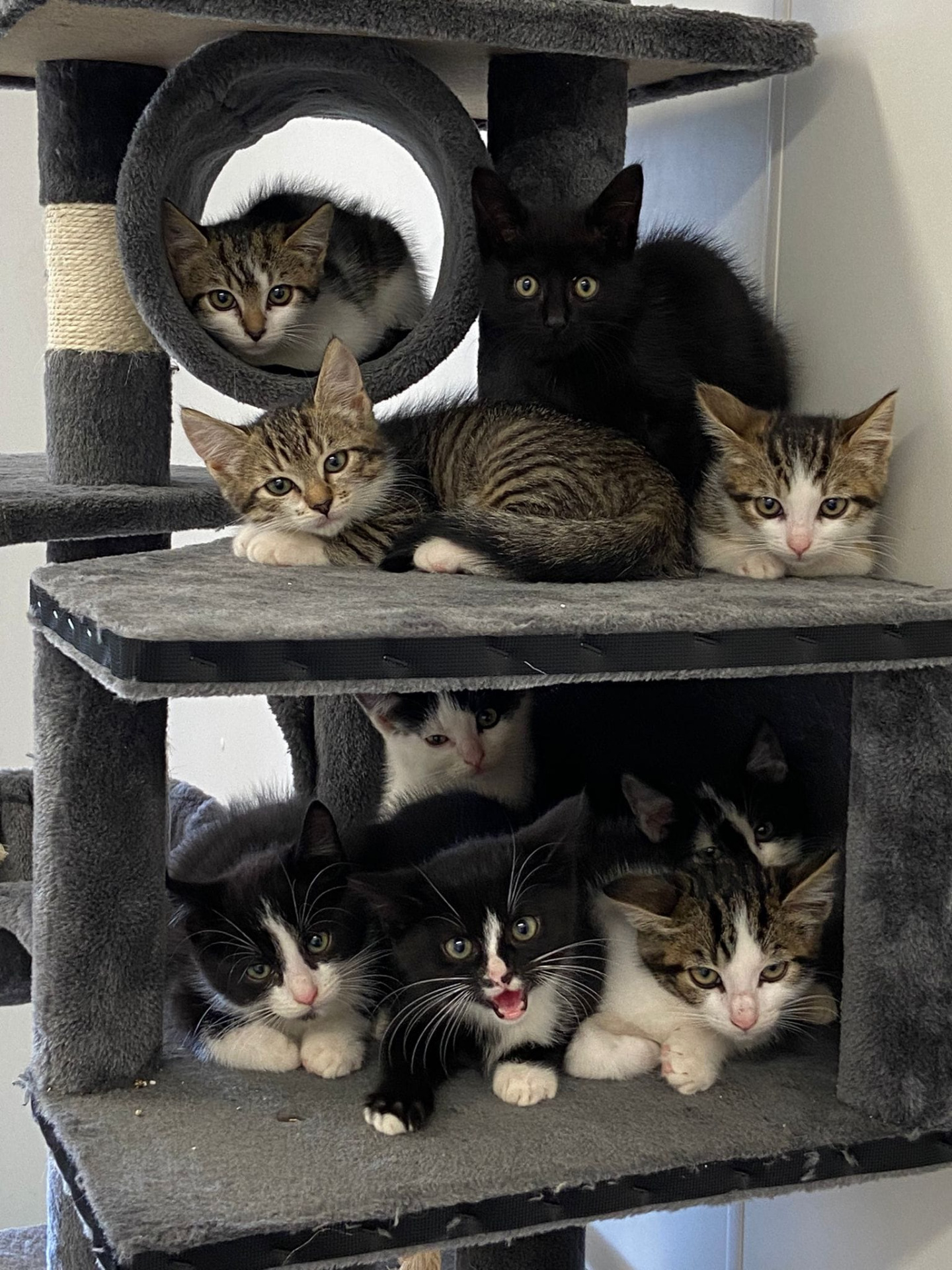 Zoals overal op dit moment is het erg druk bij Kato. De meldingen blijven binnen komen. In een van onze kamers zitten heel veel vriendjes van dezelfde plek. We vonden ook een eenling die heel hard riep om soortgenootjes, dus die mocht erbij. Hoewel wij mooie ruime kamers hebben, vinden deze kittens het veel gezelliger dicht bij elkaar op de klimpaal. Vannacht zijn er weer 2 bij gekomen, zij staan nog niet op de foto.