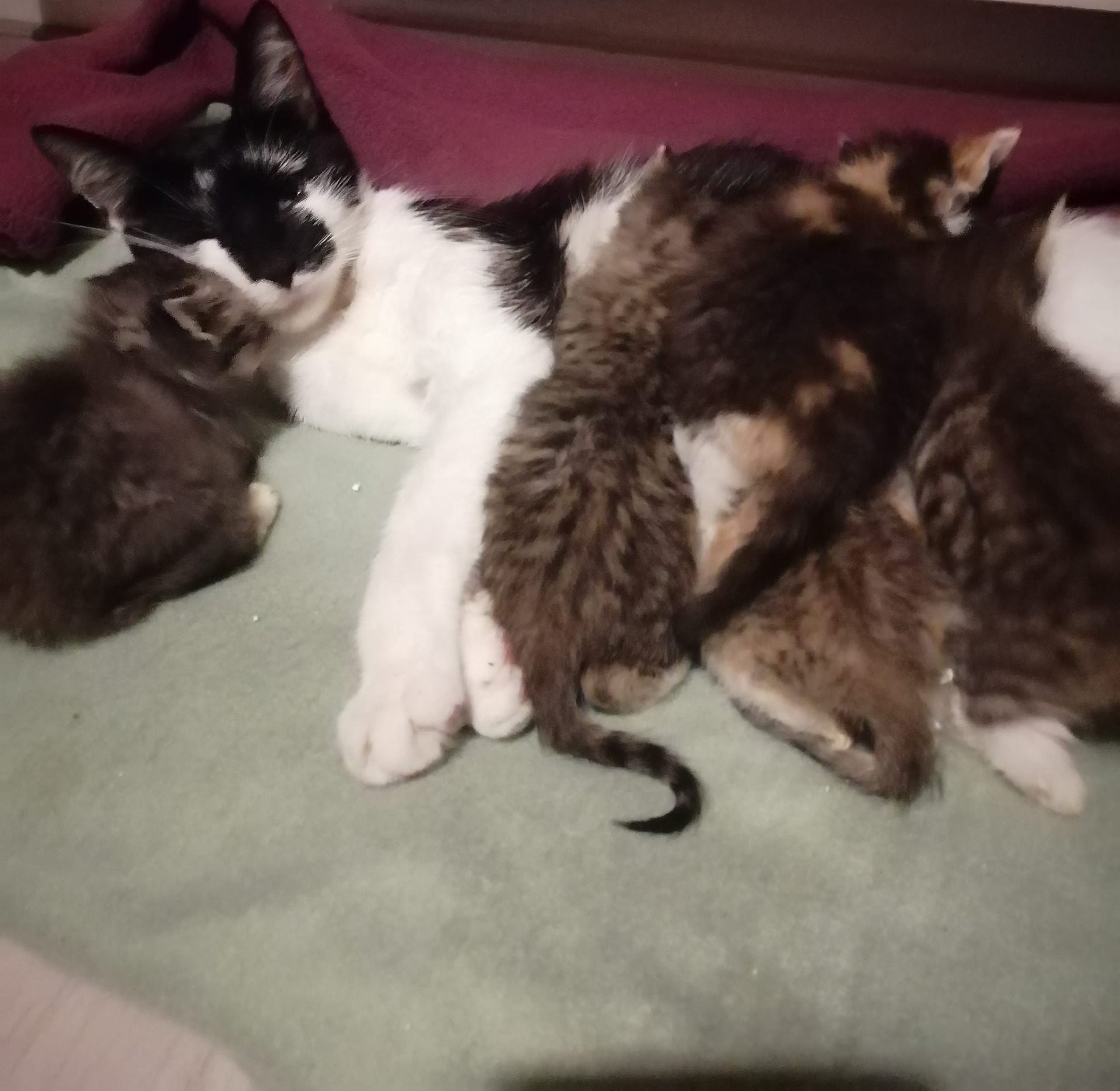 We kregen melding van 7 kittens. Bij ophalen bleken helaas 2 al overleden. Mama was een zwerfpoes. In de tuin bevallen. Ze bleef veel weg en leek de kittens niet meer te voeden. Dan maken wij melding bij de gemeente om mama te vangen, steriliseren en terug te plaatsen.